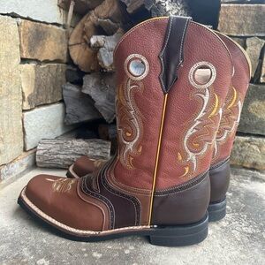 Cowboy boots, crafted from rich brown leather and adorned with intricate white & gold stitching. These boots feature a classic square toe and pull straps for easy wear, embodying the essence of Western style with their high-quality construction and polished finish. New with box FLAW- small scuff on left boot.