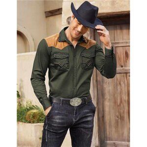 【Stylish Unique Design】Creative vintage embroidery, turn down collar, 2 buckle chest pockets, adjustable cuffs, slim fit casual button down shirts, classic retro patchwork shirt. This western dress shirt with two-color contrast embroidery and contrasting suede on the shoulders blends western-cowboy with modern fashion style