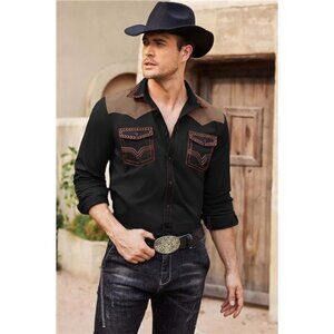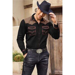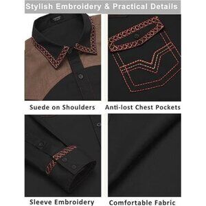 【Stylish Unique Design】Creative vintage embroidery, turn down collar, 2 buckle chest pockets, adjustable cuffs, slim fit casual button down shirts, classic retro patchwork shirt. This western dress shirt with two-color contrast embroidery and contrasting suede on the shoulders blends western-cowboy with modern fashion style