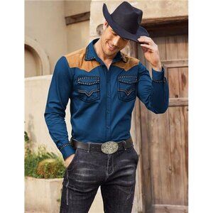 【Stylish Unique Design】Creative vintage embroidery, turn down collar, 2 buckle chest pockets, adjustable cuffs, slim fit casual button down shirts, classic retro patchwork shirt. This western dress shirt with two-color contrast embroidery and contrasting suede on the shoulders blends western-cowboy with modern fashion style