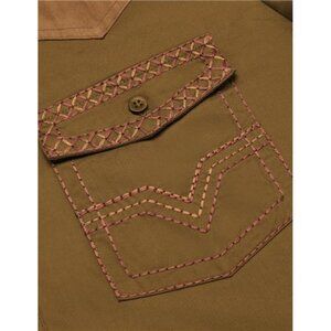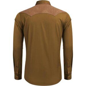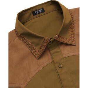 【Stylish Unique Design】Creative vintage embroidery, turn down collar, 2 buckle chest pockets, adjustable cuffs, slim fit casual button down shirts, classic retro patchwork shirt. This western dress shirt with two-color contrast embroidery and contrasting suede on the shoulders blends western-cowboy with modern fashion style