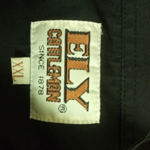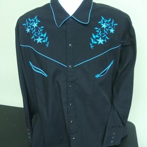 Black long Sleeve Embroidery Accented Cowboy Shirt. Snap Front and Snap Cuffs. Piped pocket and piped back yoke. Standard measurement apply.