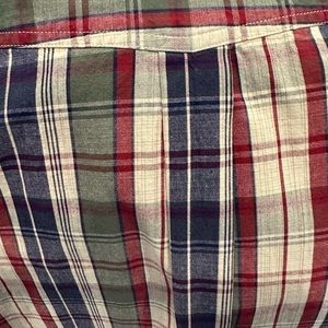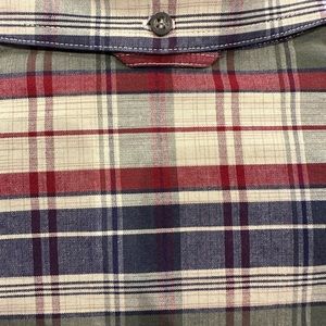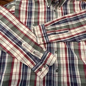 100% Cotton. Heavy Duty. Double front pockets. Double buttons on wrists. The small button on each wrist could be removed. Both are cracked. There are 3 extra buttons that come with it. Very nice shirt.