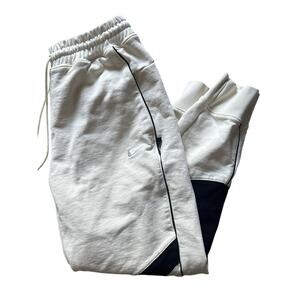 The product is a pair of men's Nike sweatpants in white with a large swoosh design. These regular fit sweatpants are ideal for activewear occasions, offering both style and comfort. The size M ensures a comfortable fit for men who want to stay active in style with their favorite activewear brand.