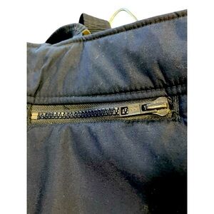 White Stag Action Sports ski pants feature a low bib and adjustable suspenders. Boot cut pant legs with gaiters. Zipper front pocket high on bib.. Ribbed elastic bands at the sides. Zipper claure