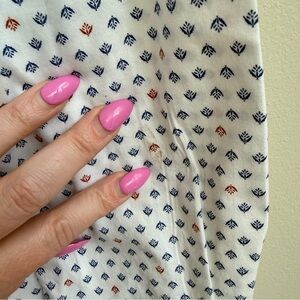 Elevate your casual wardrobe with this stylish white and blue patterned button down shirt. Perfect for any occasion. Has a few marks pointed out in photos, could possible wash out. But be aware this shirt has a few areas where stains are