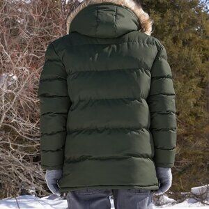 Stay warm and protected from the winter elements with this Men's Winter Coat from JAWERU. Made from durable polyester material with a fleece fabric type, this mid-length windbreaker features a full zip closure with button and drawstring accents, ensuring a secure fit. The coat is lined with polyester and insulated with down, making it both water-resistant and windproof. Ideal for outdoor activities such as travel, camping, skiing, and hiking, this coat is designed with a green solid pattern and fur trim accents. It also includes zipped pockets, a removable hood, and a hooded design, making it perfect for everyday wear, workwear, and business attire. This coat is a must-have for anyone looking to stay warm and stylish during the cold winter months.