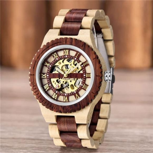 Men's Wooden Watch Skeleton Automatic Movement Wood Watch Self-Winding Watches