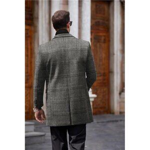Men's Wool Blend Coat with Detachable Plaid Scarfs Black Plaid