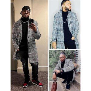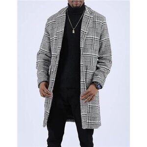Men's Wool Blend Pea Coat Notched Collar Single Breasted Plaid Black