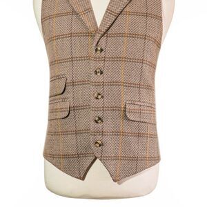 Mens Wool Vest 46R Beige Tan Plaid Windowpane Waistcoat Preppy British Heritage