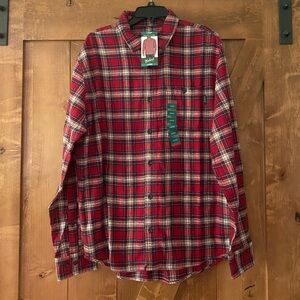 BNWT. Men’s size large. Red, white and navy blue flannel. 100% cotton.