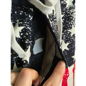 These pre-owned World Calhoun swim trunks feature an American flag design. The upper portion is navy with white stars, while the lower part has red and white stripes. Made of 100% polyester, they have a drawstring waist and a small pocket on the right side. The fabric shows some wear, with slight fading and minor imperfections in the print. Size XXL but run small