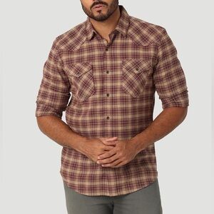 Men's Wrangler Cloud Flannel Free To Stretch Shirt Size Small Plaid Tan
