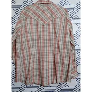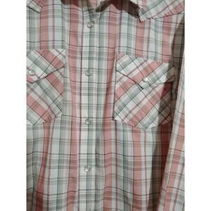 Details: Embrace a fusion of style and comfort with the Wrangler pearl snap long sleeve button-front shirt. This vibrant shirt features a striking plaid design in light coral and green hues, adding a touch of flair to your wardrobe. Crafted from a blend of 55% cotton and 45% polyester, it offers a balance of breathability and durability. The classic pearl snaps enhance its Western-inspired charm, making it a versatile choice for both casual outings and laid-back gatherings.