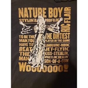 This Men's Wrestle Mania Ric Flair Nature Boy T-Shirt in XL size features a graphic print with a 90s retro theme, perfect for fans of WWE and wrestling. Made from breathable cotton knit fabric with a crew neck and short sleeves, this black t-shirt is suitable for all seasons and is machine washable for easy care. The shirt showcases an iconic logo accent and embodies the character of a warrior, making it a stylish and comfortable choice for any wrestling enthusiast looking to add a touch of nostalgia to their wardrobe.