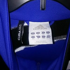 A royal blue with balck and white accents mens XL running jacket made by Adidas. The Adidas logo is embroidered on the right side of the torso. The pull tab has a metal Adidas logo. Both sides have zipper pockets. Bottom left side is a drawstring for adjusting. There is little to no damage. The only thing i have found is the clima cool lettering on the bottom has faded. Its fall so get it while you can! Very dope. Very clean.