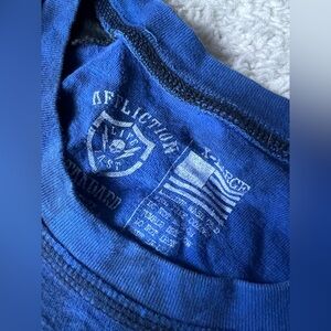 Vibrant blue tee with Affliction branding. Features bold graphic elements.