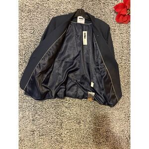 Elevate your formal wardrobe with this sophisticated navy wool blend blazer. Designed for the modern man, this classic fit blazer features a point collar and is fully lined for comfort. The gold buttons add a touch of elegance, while the two front pockets and inner pockets provide practicality. Perfect for fall occasions, whether it's a business meeting or a formal event, this blazer ensures you look sharp and polished. This item is pre-owned and in excellent condition.