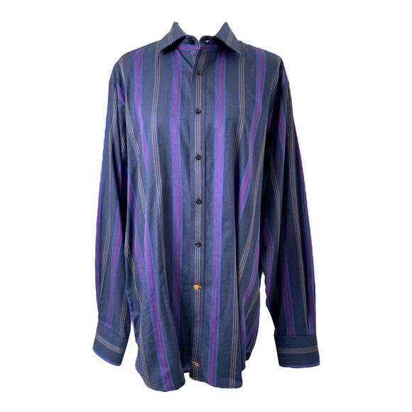 Mens XL Button Down Shirt Thomas Dean Blue and Purple Striped Long Sleeve. Very clean and well-kept condition. No major damage or stains that we saw at all. May have Some light wear from use and storage but still in good condition.