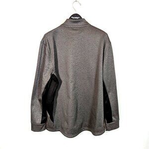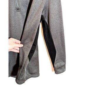 Excellent condition with virtually no signs of cosmetic wear. Soft yet durable stretch polyester material with a warm microfleece interior. Heathered gunmetal gray color with black accent panels. Quarter zip closure.
