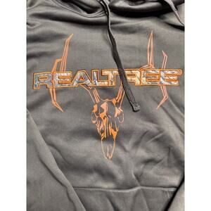 RealTree men’s hoodie in size XL. This soft, durable sweatshirt is a mix of cotton and polyester and features a gray body with bold orange RealTree branding on the front. The interior of the hood is lined with the classic RealTree camo pattern, adding a rugged touch.