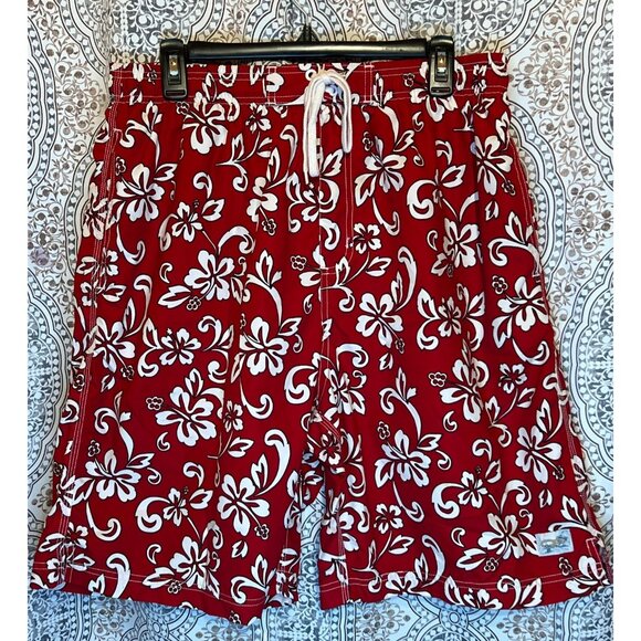 Mens XL Red Hawaiian Floral Swim Trunks With Drawstring & Elastic Waist