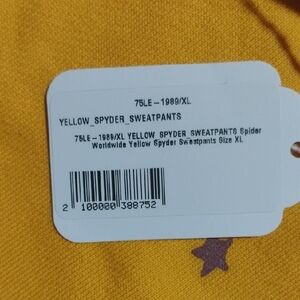 Yellow xl spider jogging sweatpants. the sp5der is navy blue, and has teal and purple stars in front of joggers. Backside is plain. New with tag.