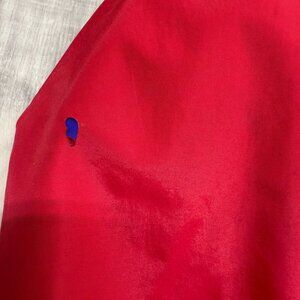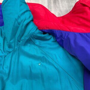 This windbreaker jacket features a vibrant red and blue colorblock design, zipper pockets, and an elastic hem for practicality and style.