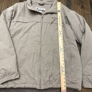 This Men's XXL Columbia Omni-Shield Water Resistant Fleece Lined Winter Coat is a versatile and warm outerwear option for the winter season. Made with a cotton blend outer shell and lined with cozy nylon fleece, this mid-length jacket features a zip closure and is suitable for various occasions such as travel, casual outings, and workwear. The beige color and solid pattern make it a classic and timeless piece, while the polyester insulation material ensures added warmth during outdoor activities like walking, skiing, and hiking. With the Columbia brand name and logo accents, this jacket combines style with functionality for the modern man.