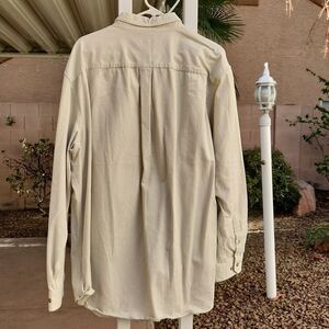 Excellent used condition. Worn once. Men's XXL 100% heavy weight cotton twill button down casual tan shirt. Pit to pit measures 28". shoulder to bottom hem is about 33"