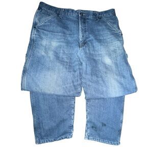 Vintage Y2K Wrangler lined carpenter work jeans. Insulated fleece lined workwear utility denim cargo pants in blue denim wash, relax fit with extra pockets and hammer slide. Grunge skater or streetwear outfit or baggy cargo look. 36" x 34"