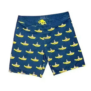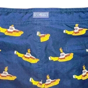 Pre-owned men's Beatles inspired swim trunks featuring a navy blue background with a repeated pattern of yellow submarines. The shorts have a yellow drawstring waistband and a single back pocket. The shorts are made of a lightweight, quick-drying fabric. The shorts are in good condition with no visible tears or stains. The size is 36. The brand is SEC. 119. The shorts are a "Yellow Submarine" product. The shorts are approximately 19 inches in length and 32 inches in waist. The shorts are in excellent condition.