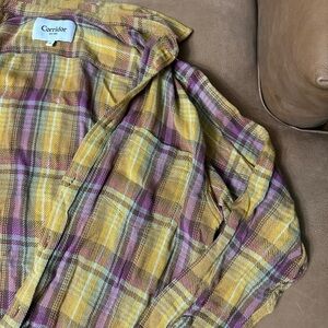 Elevate your casual wardrobe with this men's shirt. Featuring a vibrant yellow and purple plaid design, this button-down shirt offers both style and comfort. Perfect for any casual occasion.