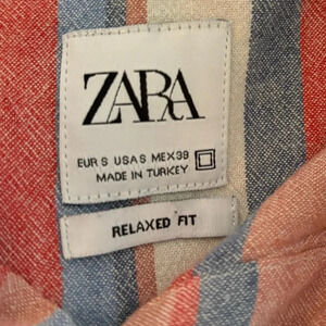 Men’s Zara Shirt Sleeve Button up Shirt. Size S (U.S.). Pale red, cream and blue stripes with one front pocket. Relaxed fit. Likely a linen blend.