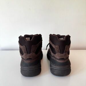 Borrowing the suede toe box and oval overlays from the Yeezy 500, 2019's Yeezy Desert Boot 'Oil' takes Kanye West's signature line into boot territory. The three-quarter cut upper comes in a smooth suede and mesh, with thick rope laces and an exaggerated mudguard. The chunky foam midsole pairs with a thick rugged outsole for outdoors-ready cushioning and traction. The entire silhouette comes in an earth-toned motif, with just a bit of branding on the bottom of the sole.