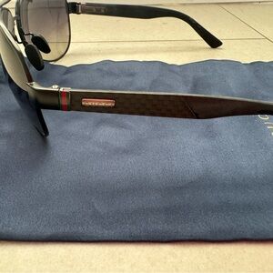 Authentic Gucci men’s aviator sunglasses with polarized lenses. Legs feature carbon fiber and rubber finish With the quintessential Gucci stripes.