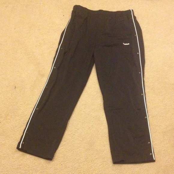 Men's black Reebok button downs. I don't see any, but to be safe very very few, if any snags at all. Button all the way down. White stripe going down sides. Perfect condition.