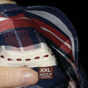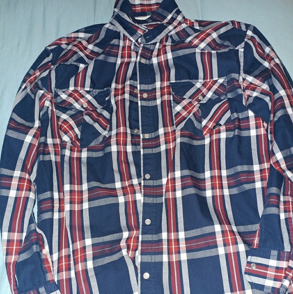 Mens red white and blue plad button down with snap clasps instead of buttons. Size xxl