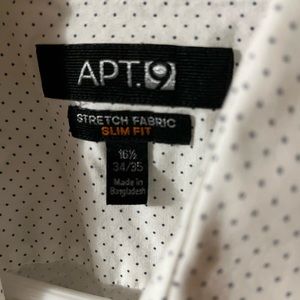 White with black dots, slim fit button down by Apt 9. Size 16 1/2, 34/35. Excellent condition (excuse the wrinkles; it was in a box for awhile). Has some stretch to it.