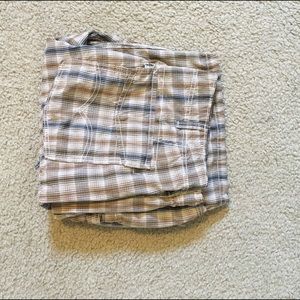 NWOT Blue and tan striped Men's cargo shorts with back pockets. 100% cotton and never been worn.