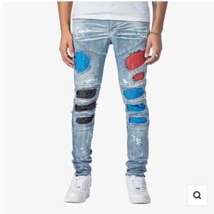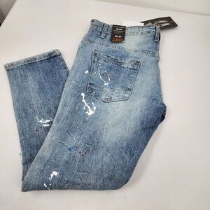 Men’s copper rivet slim straight jeans paint splatter leather patch 38 x 32