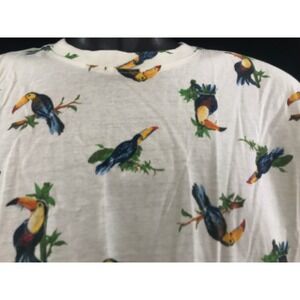 You are purchasing a nice off white t-shirt by Knickerbocker. This shirt is size M, according to the interior tag. The chest measures 20 inches and the length is 28 inches. The shirt has a images of Toucans and is 100% cotton. It is new with tags.