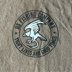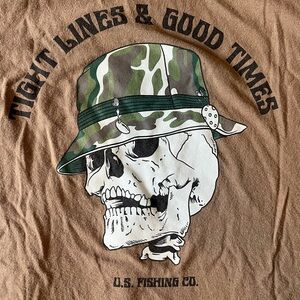 Men's fit medium tan shirt. Small U.S. fishing company logo on front and large graphic on back. "Tight lines & Good times" #tightlines #goodtimes #fishing