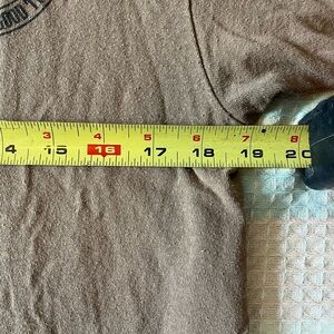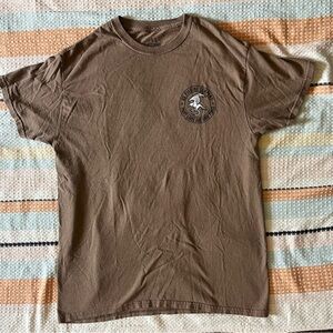 Men's fit medium tan shirt. Graphics on both sides