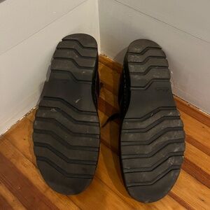 Gently used men’s Clark’s brown lace up business casual shoes. Slight creasing in toe area, slightly worn soles.