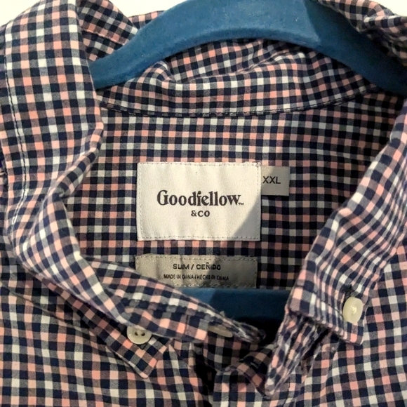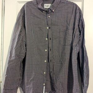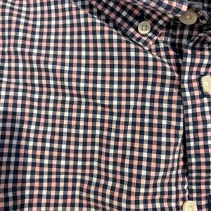 Navy blue, pink, and white gingham button down shirt in great shape. my husband works totally remote now so this has been hanging in the closet a while, but this brand steams up very well and is great for those transitional summer to fall weddings!