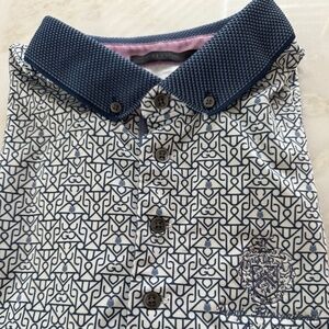 Beautiful man’s golf shirt by Greyson. It has the Trump International golf club will go on the front. It has a dark blue design on a green background with a dark blue collar that is button down. It also has a pale pale green inside of the collar. It is practically brand new.