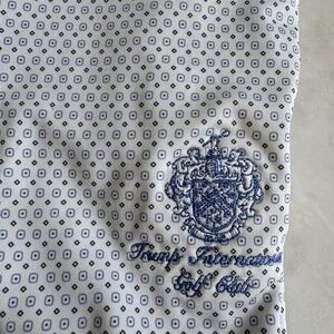 Very attractive man’s golf shirt by Greyson. It is a light blue pattern on a white background. The inside of the placard is blue. It has the Trump International golf club logo on the front. Practically brand new.