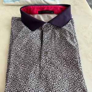 Beautiful man’s golf shirt Greyson. It has a very deep purple design on a white background. The collar is purple, and inside of the collar is a dark pink. Inside of the placard is purple as well. This is an extremely stunning shirt.
